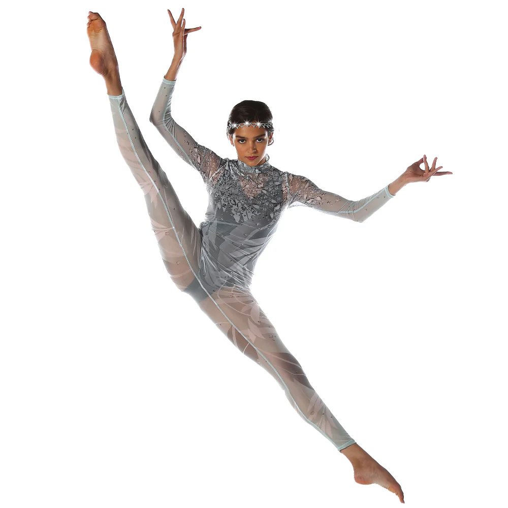 A whimsical mesh unitard with a beautiful dye sublimated muted green foundation color, overlayed with an all-over leaf print and silver gem rhinestones cascading from the neckline to the middle bodice. With the graphics ending at the waistline, this will elongate the legs and lines of the body. This costume is sure to add a special element to any routine. Mock neckband with a center back zipper closure. Mesh, Polyester, Spandex.