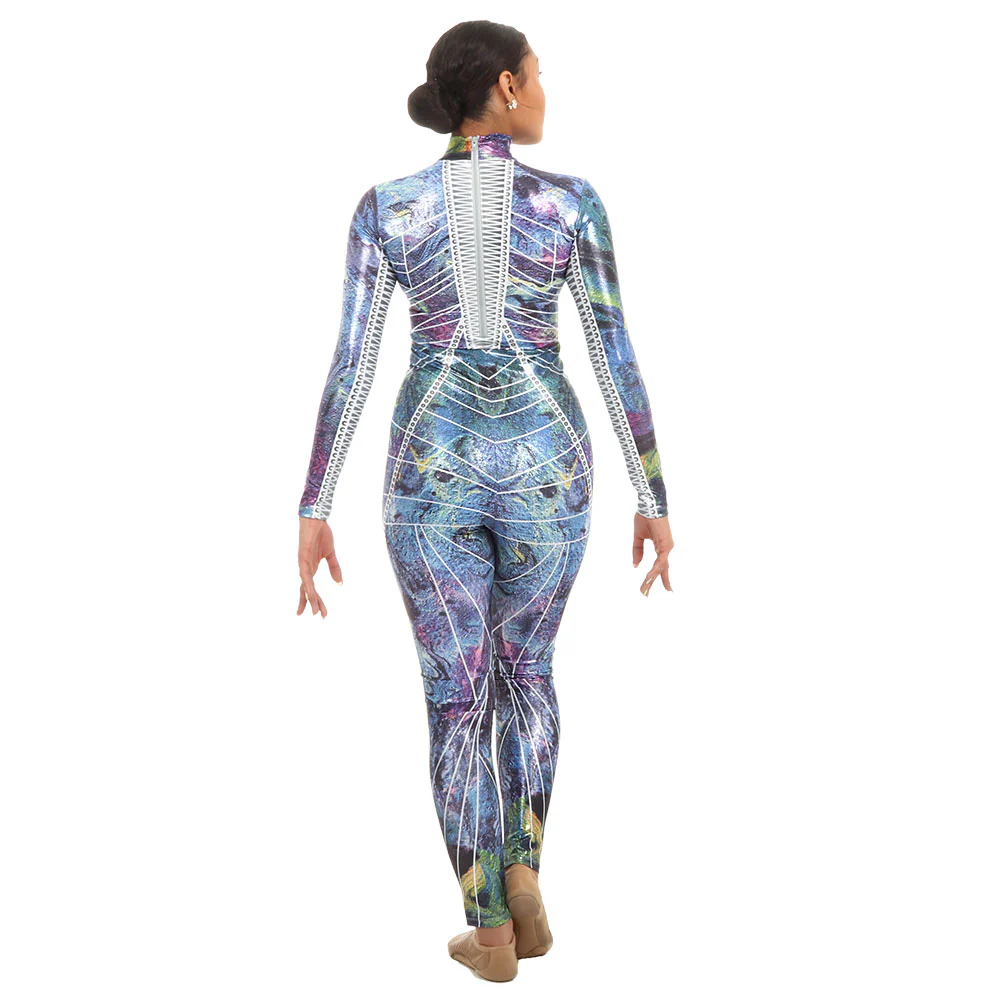 The Galaxy Princess Unitard is a full coverage, long sleeve mock neck foil unitard. The style lines and laced details on the unitard and underneath the sleeves add the extra sheen to this futuristic unitard.